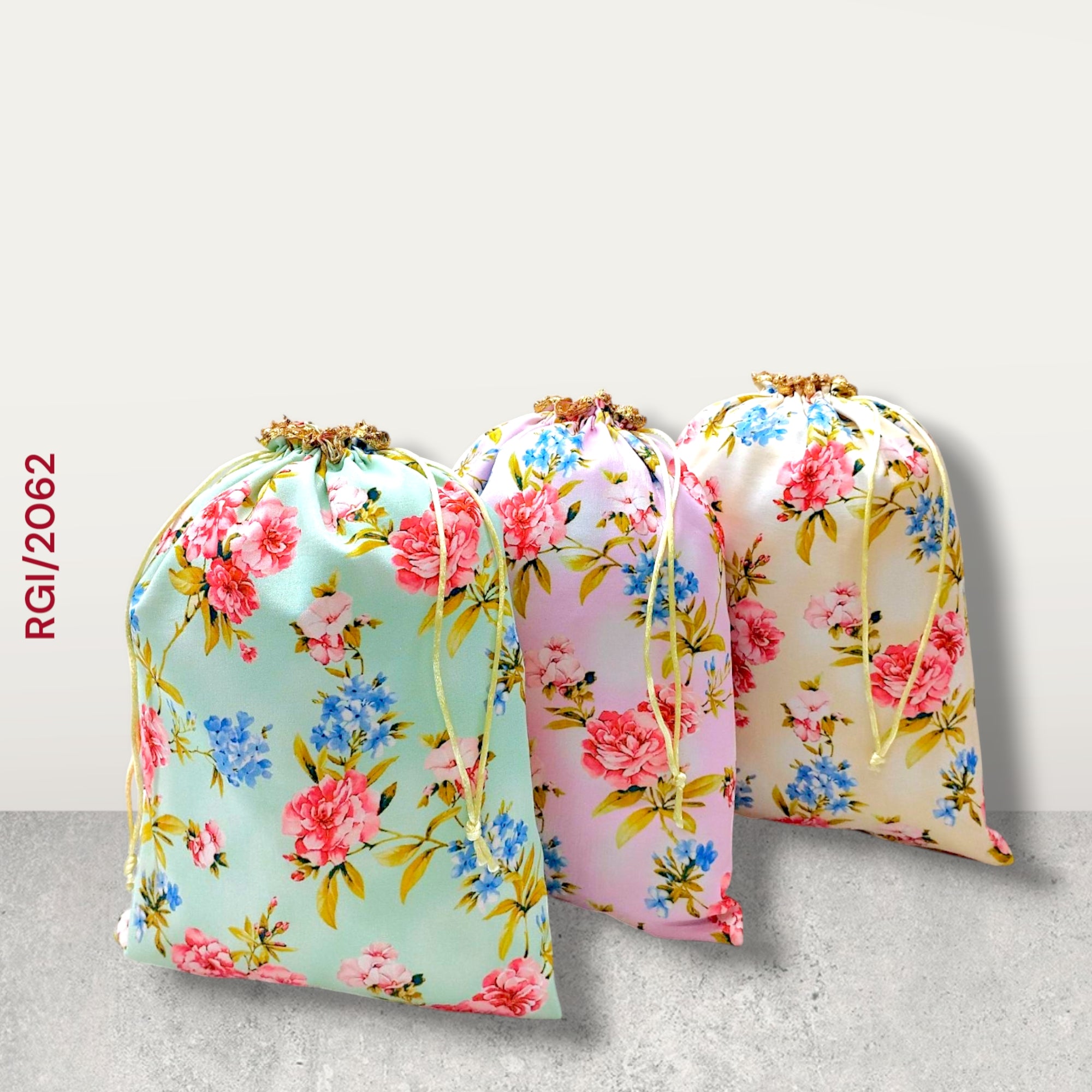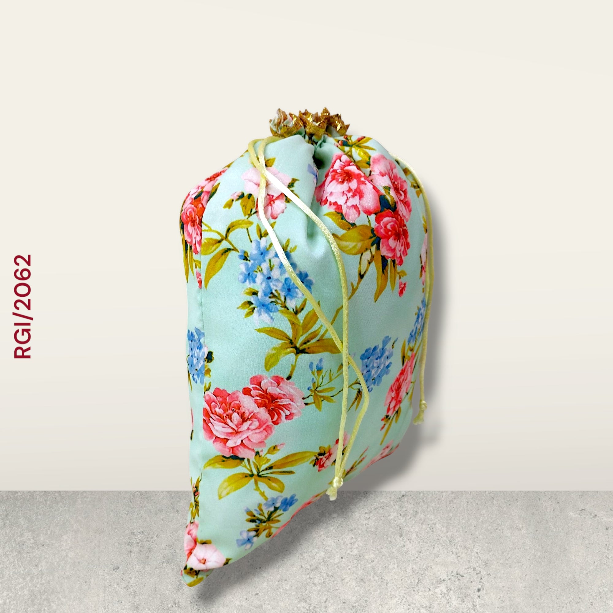 Turn every gift into a graceful gesture with the RGI/2062 Floral Potli Bags—a charming collection that captures the delicate essence of spring and vintage garden blooms. Perfect for weddings, festivities, or boutique gifting, these potlis blend timeless floral aesthetics with the luxurious sheen of satin. Each potli in this collection features a vibrant floral print showcasing lush roses and pastel blue blossoms with leafy vines, set against a background of soft, romantic hues Premium-quality satin fabric with a silky texture and elegant drape. Print All-over floral digital print in vivid, fade-resistant colors. Wedding favors and bridal return gifts Baby showers and milestone celebrations Festive gifting (Diwali, Eid, Christmas Boutique packaging for accessories, bangles, or handmade items Eco-friendly reusable gift bags These potlis hold their shape beautifully while remaining flexible and lightweight. Pair these potlis with pastel sarees or lehengas for an ethnic-chic look, or use them as decorative holders on your festive table scape to charm your guests.