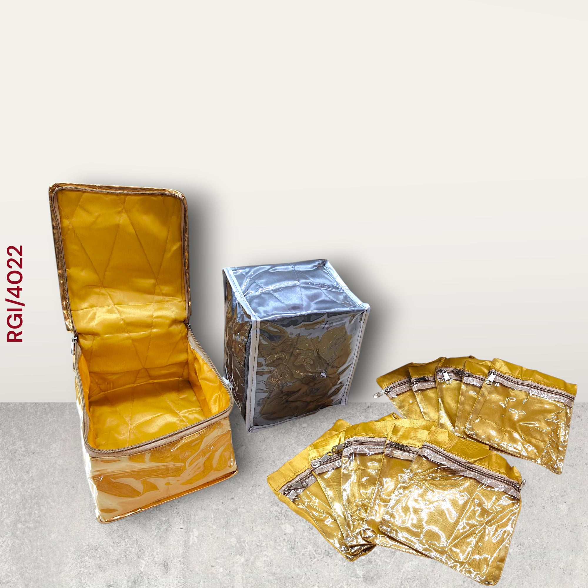 This elegant set of golden and transparent organizers is designed to keep your wardrobe and dressing table clutter-free while adding a touch of style. The golden zippered pouches are perfect for storing jewelry, cosmetics, or small essentials, while the cube organizer with a clear finish allows easy visibility of the items inside. The sturdy golden boxes with quilted lids provide safe storage for delicate pieces, making them ideal for gifting or personal use. Practical, stylish, and durable, this set is a must-have for organizing everyday essentials with ease.
