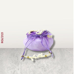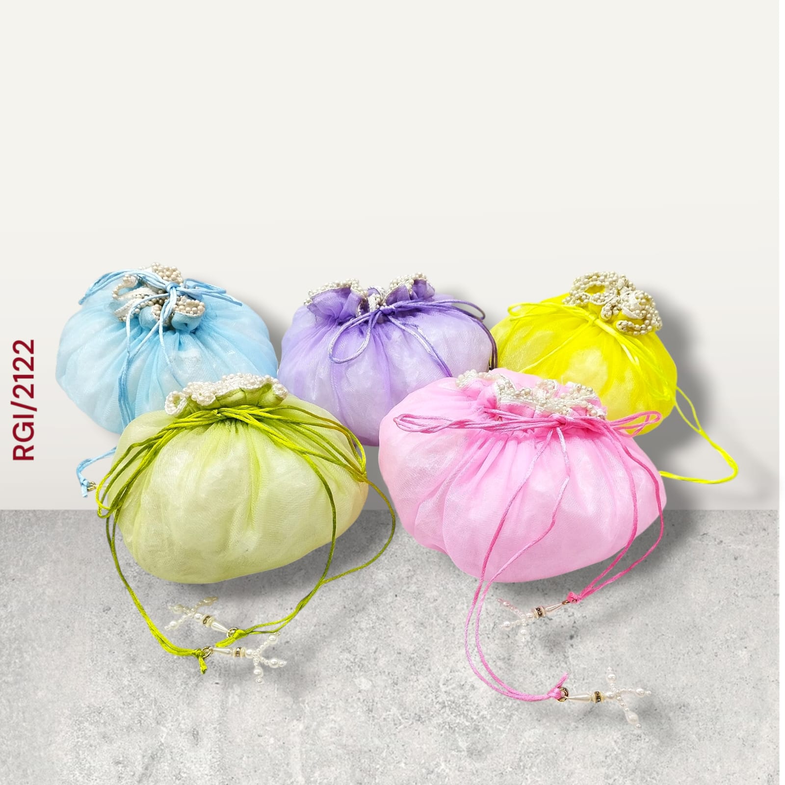 These colorful potli bags are crafted from soft organza fabric and designed in round pouch style with a delicate drawstring closure. Each bag is adorned with pearl embellishments on the top, adding a touch of elegance and charm. Available in vibrant shades of blue, purple, yellow, green, and pink, they are perfect for gifting, weddings, or festive occasions, making every presentation look graceful and stylish.