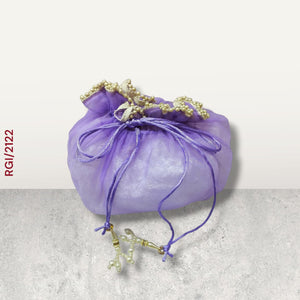 This elegant lavender potli bag is crafted from sheer organza fabric and styled with a soft drawstring closure. The top is beautifully decorated with pearl embellishments, giving it a rich and graceful appeal. Its delicate finish and charming design make it a perfect choice for gifting, weddings, festive occasions, or as a stylish accessory to carry small essentials.
