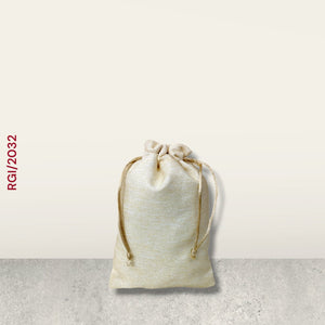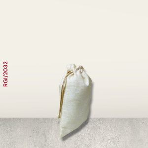 The potli is a minimalist, eco-friendly, and rustic packaging solution ideal for sustainable gifting. With its earthy charm and subtle texture, this potli offers a versatile and natural presentation for your festive and gifting needs. Made from high-quality jute-look fabric with a fine weave, offering the appearance of raw jute but with a smoother and more flexible finish—comfortable to handle and aesthetically natural. A light beige or cream tone, reminiscent of natural fibers. The neutral shade complements both traditional and contemporary gifting themes. Visible weaves give it an organic, handcrafted appearance, lending a touch of authenticity. Comes with durable matching beige drawstrings, making it easy to secure the contents while adding to the bag's rustic appeal. Neatly finished seams and reinforced edges ensure durability even when filled to its maximum 250g capacity Suitable for up to 250 grams, making it Dry fruits and nuts Herbal products or wellness gift Eco-friendly wedding or event favor Small souvenirs or artisanal products Easy to carry, store, and display without being bulky. Perfect for brands or individuals promoting sustainability and eco-conscious gifting Organic product packaging Nature-themed events Return gifts at weddings or baby showers Temple or pooja gift offerings