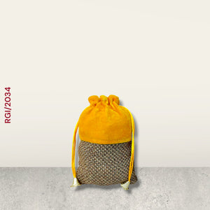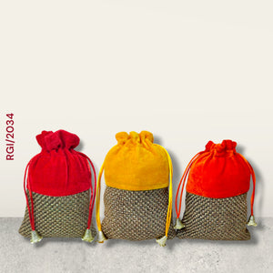 This new arrival velvet jute potli bag, available in yellow, red, pink, and orange, is a budget-friendly, plain 5*7 inch bag perfect for dry fruit gifts, with a 250 gm capacity and a minimum order quantity of 36 pieces, making it an ideal latest potli choice for stylish and practical gifting.