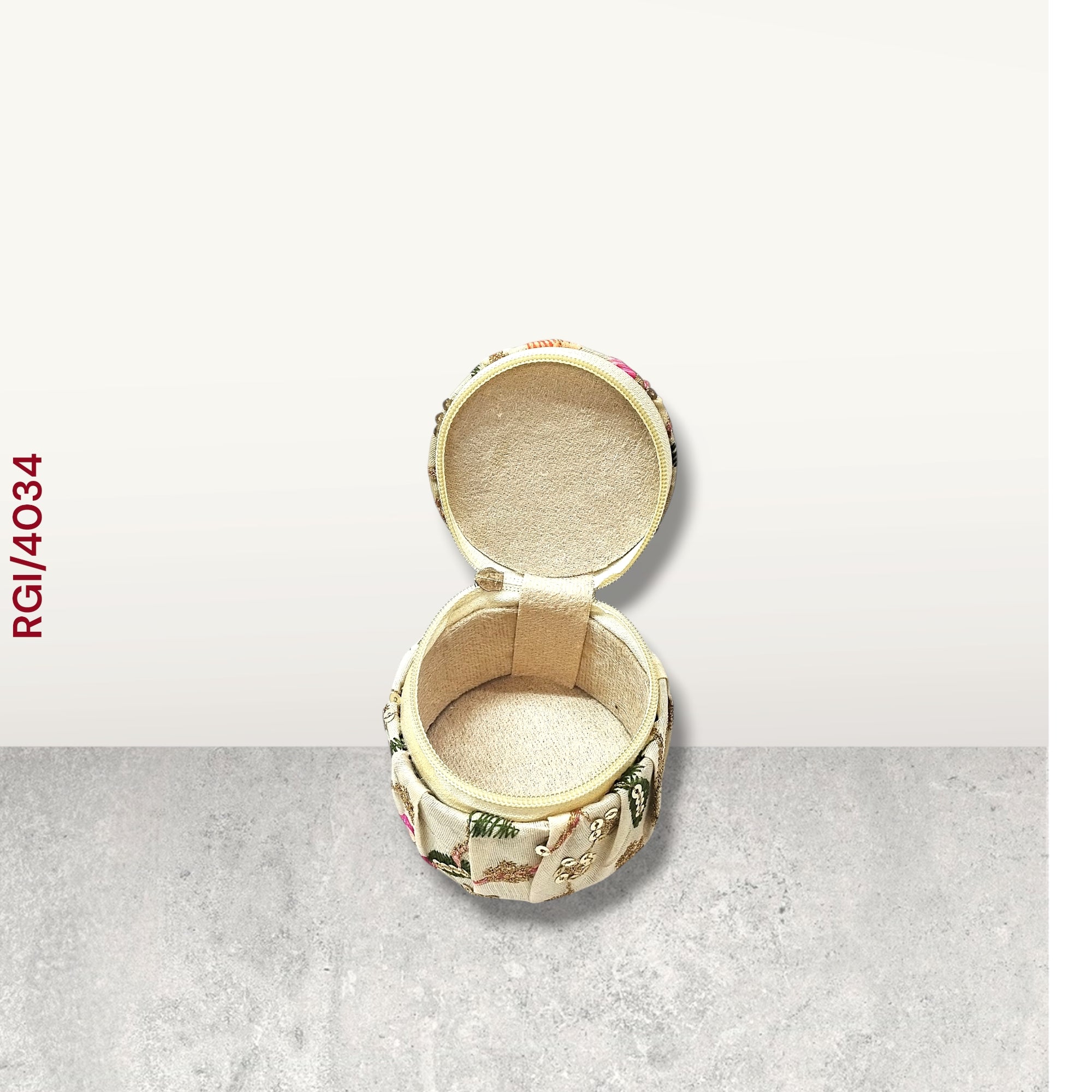 This 3.5-inch silk flower embroidery jewellery box is a charming blend of elegance and functionality. Made with rich silk fabric, it features intricate floral embroidery with delicate threadwork and sequins, giving it a festive and luxurious look. Its compact matki-style design makes it perfect for storing bangles, earrings, rings, or other small jewellery pieces while keeping them safe and organized. Lightweight and easy to carry, this jewellery box is ideal for personal use, gifting, or as a return gift option for weddings and celebrations.