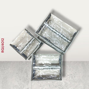 Organize your essentials in style with this Set of 3 Transparent Zipper Storage Bags. Crafted from high-quality clear PVC, each bag features a sturdy zipper closure and durable fabric lining along the edges. The transparent design allows for easy visibility of contents, making them perfect for storing clothes, sarees, accessories, toys, or travel items. The stackable, space-saving design helps keep your wardrobe or drawers tidy and clutter-free. Ideal for both home storage and travel use. Set includes 3 sizes: Small, Medium & Large Transparent design for easy viewing Double zipper with strong pulls for secure closure Reinforced fabric edges for durability Stackable and collapsible for convenient storage