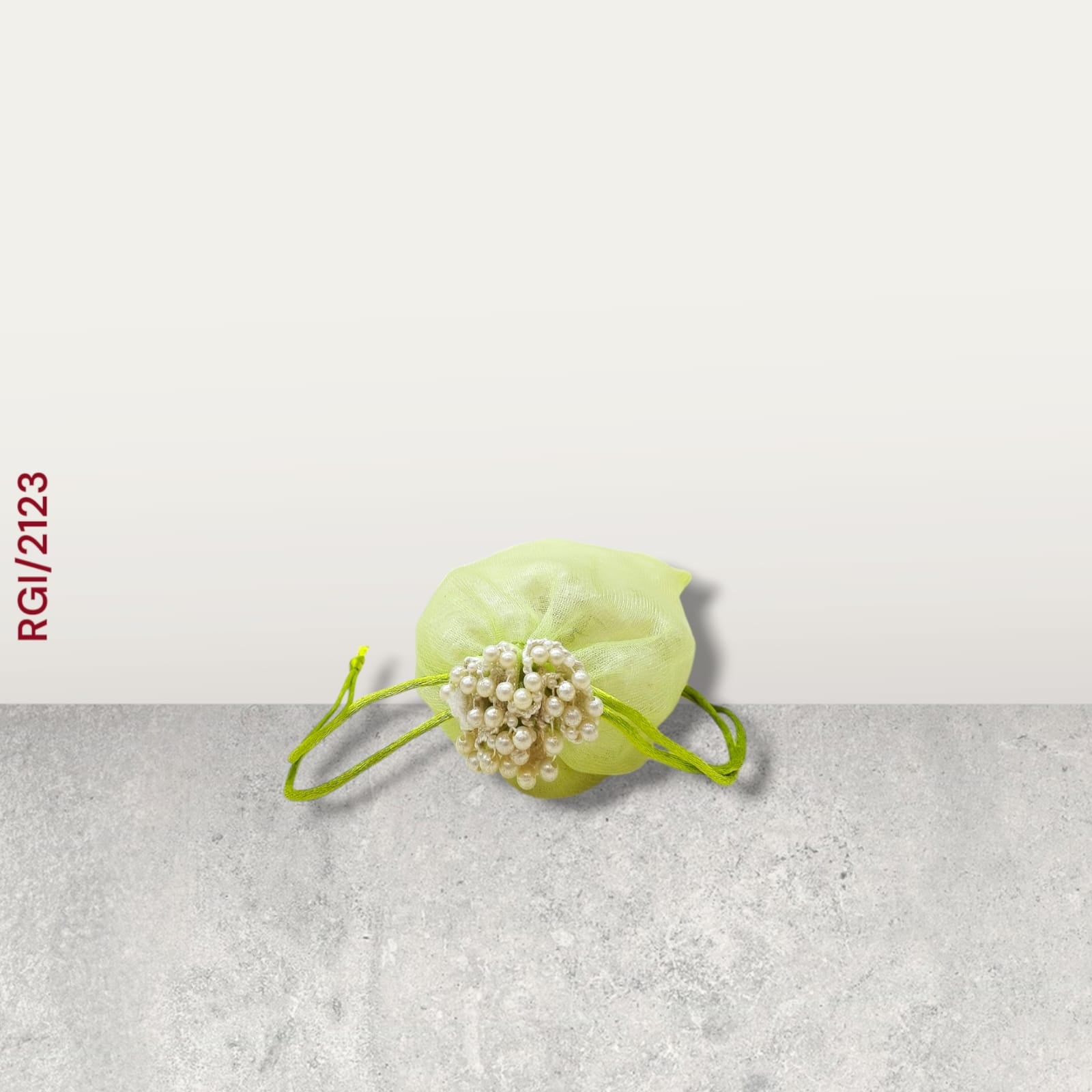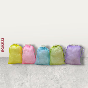 This 5x7 inch tissue net pouch is a charming and elegant choice for gifting and packaging. Made with delicate net fabric, it has a soft and lightweight feel with a sheer finish that adds a touch of sophistication. Available in a variety of pastel shades, each pouch is designed with a drawstring closure for easy use and is embellished with pearl detailing on the top, giving it a graceful look. Perfect for return gifts, weddings, parties, or festive occasions, these pouches can be used to hold chocolates, dry fruits, jewelry, or other small keepsakes in a stylish way.