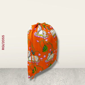 Bring home the serene spirit of tradition with the RGI/2055 Potli Bag, exquisitely designed in vibrant orange fabric and adorned with a divine motif of sacred cows resting on lotus blooms. This potli seamlessly blends vibrant aesthetics with spiritual symbolism, making it a meaningful and beautiful choice for gift-giving, pooja rituals, or festive packaging. A lively and auspicious color often associated with Hindu rituals and festivals. The radiant orange makes this potli visually striking and spiritually uplifting. Featuring calm, white cows seated gracefully atop pink lotuses with green vine embellishments, this design represents purity, abundance, and divinity. The artwork celebrates the sacred cow (Gau Mata) – a revered symbol in Indian culture. Crafted from breathable, eco-friendly cotton material that is soft, durable, and ideal for lightweight gifting or temple offerings. Comes with a coordinated orange drawstring for easy and secure closure, maintaining the harmony of the overall design. Suitable for 200–300 grams or small gifts Pooja samagri or temple prasad Wedding giveaways with spiritual themes Diwali, Raksha Bandhan, Janmashtami gifts Cow protection campaigns or religious events Eco-friendly gift packaging.