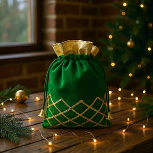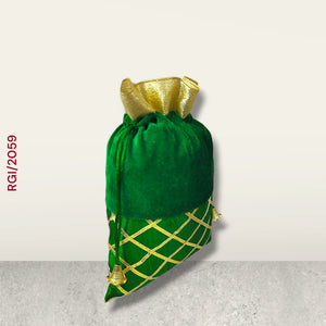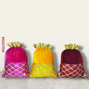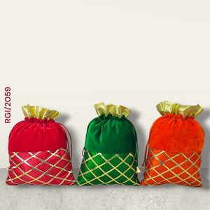 Make every occasion unforgettable with the elegant charm of RGI/2059 Velvet Potli Bags. These bags embody opulence with their plush velvet fabric and eye-catching golden lattice work—perfect for luxurious wedding favors, festive gifting, or ethnic party accessories. A rich, deep red shade that symbolizes love, prosperity, and festivity. Ideal for weddings, pujas, and Diwali celebrations .A lush hue associated with nature, harmony, and good fortune. Perfect for eco-conscious gifting with a royal flair. A vibrant orange tone with a touch of saffron—a color of energy, joy, and spiritual warmth. Ideal for haldi ceremonies and other bright occasions .The top portion of each potli is crafted from luxurious, soft-touch velvet that adds depth and richness to the bag's appearance. The bottom half features glossy golden ribbon criss-crossed into a neat diamond pattern, stitched securely over matching velvet—offering a dazzling contrast and artisanal finish. A metallic gold frill adorns the top opening, adding a glamorous edge and enhancing the drawstring closure. Coordinated strings with small gold embellishments ensure secure closure while maintaining the bag’s aesthetic appeal and decorative ends Wedding Return Gifts & Bridal Party Favors Diwali, Eid, Karwa Chauth Gifting Boutique Jewelry or Bangle Pouches Housewarming & Festive Giveaways Luxury Gift Packaging for Small Items These potli bags are reusable and durable, offering a sustainable alternative to paper or plastic gift wrapping. Ideal for storing personal items or reusing as festive décor.