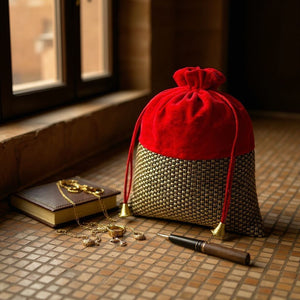 A stylish and elegant potli bag combining the rustic charm of jute with the rich allure of velvet. A perfect blend of traditional and contemporary design, making it suitable for both ethnic and semi-formal occasions. Upper Section Made from plush red velvet, giving it a luxurious look and soft feel. Lower Section Crafted from finely woven jute in a golden-brown tone, creating a textured, earthy base. Drawstrings Durable red cords with golden bell-shaped tassels, ensuring secure closure and a festive aesthetic. Perfect for festivals, weddings, party favors, gifting, and jewelry storage. Size Compact yet spacious at 7 x 9 inches, ideal for small gifts or essentials.