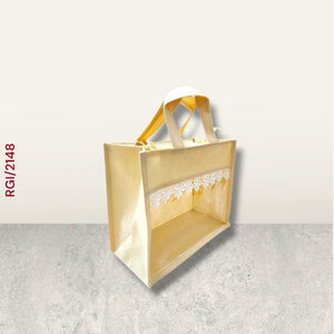 This elegant return gift bag is crafted in a soft golden hue with a transparent front panel, adorned with a delicate white lace border for a touch of sophistication. Made from sturdy non-woven material, it offers both durability and style, making it perfect for presenting gifts at weddings, festive celebrations, or special events. The strong matching handles ensure easy carrying, while the zip closure keeps contents secure, creating a beautiful blend of practicality and charm.