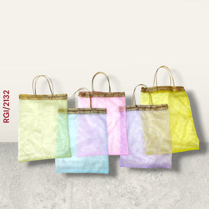 Add a touch of elegance to your gifting with these vibrant pastel organza tote bags adorned with a golden decorative lace border and sturdy golden handles. Perfect for festive giveaways, wedding return gifts, or party favors. Made with premium sheer organza fabric Elegant golden lace detailing Lightweight yet sturdy Available in beautiful pastel shades – Pink, Lavender, Yellow, Aqua Blue, Mint Green Reusable & eco-friendly Weddings | Festivals | Birthdays | Corporate Gifting | Party Favors Standard Medium (Custom sizes available on bulk orders)