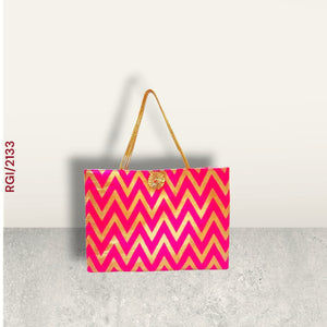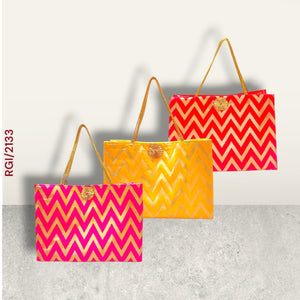 Brighten up your gifting with these luxurious chevron pattern gift bags – a perfect blend of bold design and festive charm. Crafted with rich, glossy fabric in vibrant shades, each bag features an elegant golden rope handle and a decorative button accent for a premium finish. Pink & Gold Yellow & Gold Red & Gold Material: High-quality laminated fabric with metallic sheen Design: Eye-catching golden chevron pattern Handles: Durable golden cord handles for a classy touch Closure: Stylish golden decorative button Spacious and sturdy for gifting essentials Reusable & eco-friendly Festivals | Weddings | Corporate Gifting | Party Favors | Return Gifts