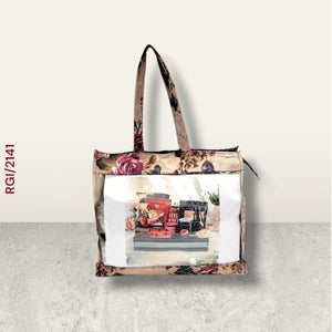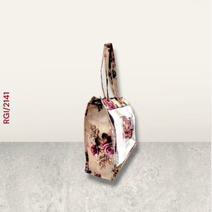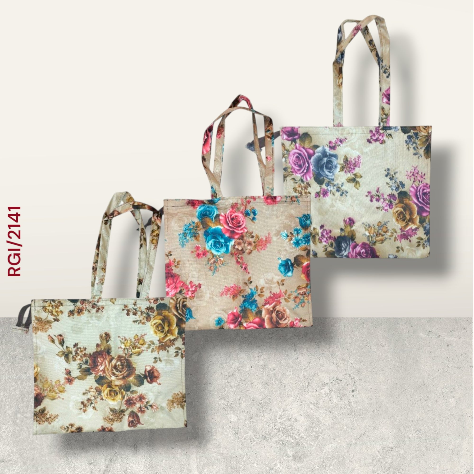 These elegant floral tote bags feature a beautiful all-over rose print in vibrant and pastel tones, set against a textured fabric background. Designed with sturdy matching handles, they offer both style and practicality, making them perfect for shopping, casual outings, or gifting. Their charming floral patterns in shades of blue, pink, purple, and gold add a timeless and graceful touch to any look.