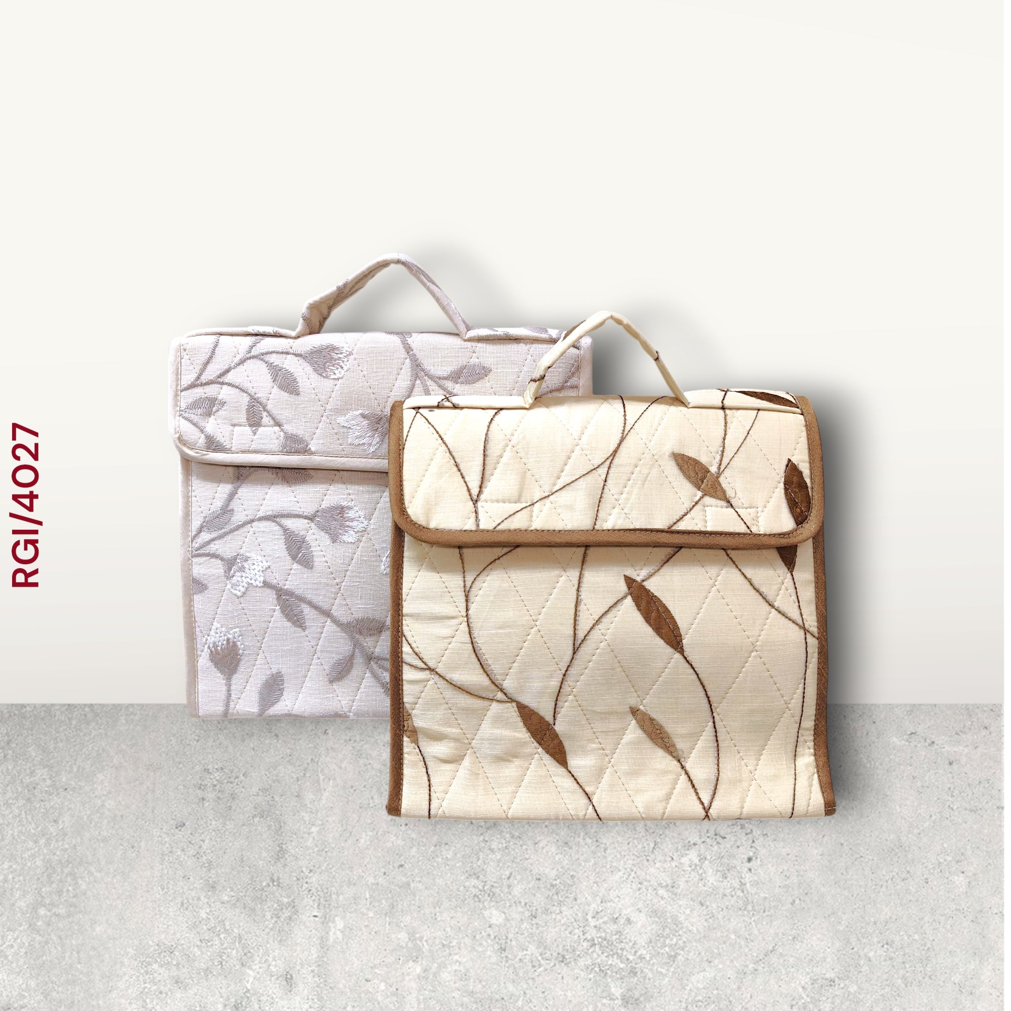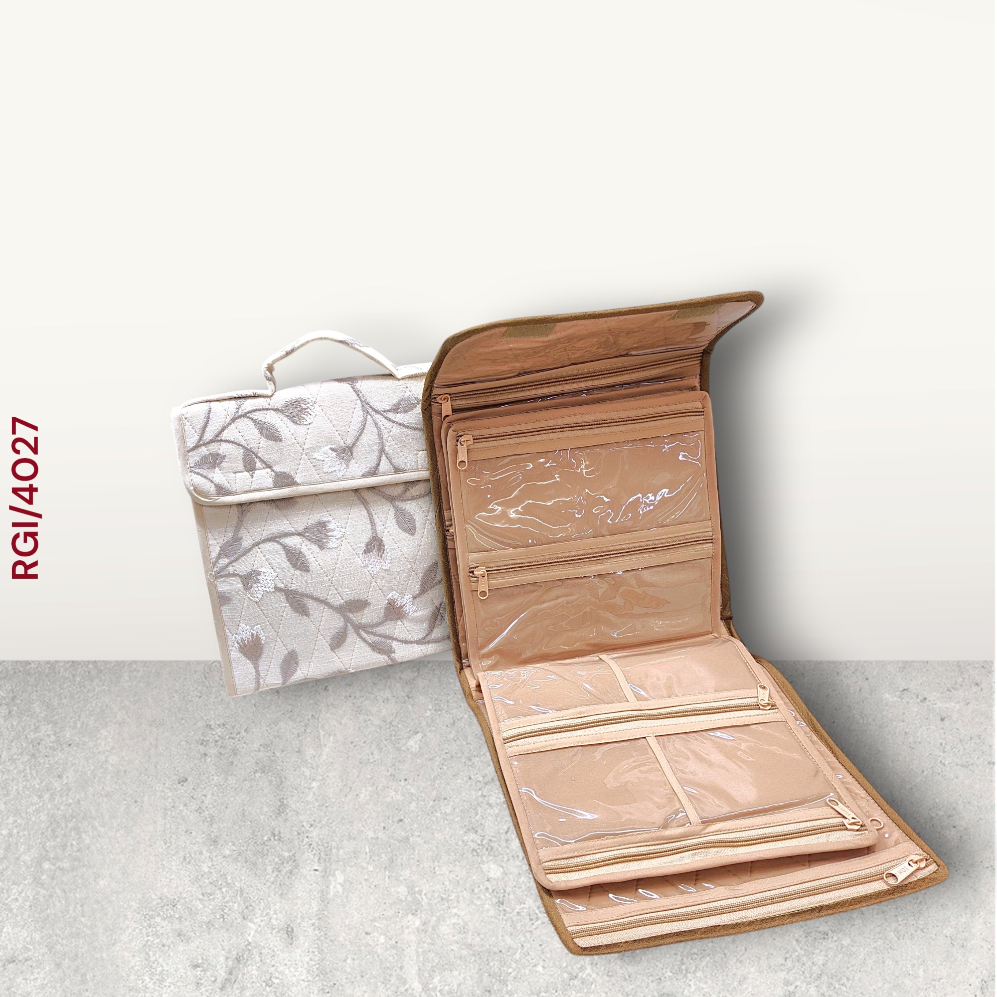 RGI/4027 is a stylish and functional multi-pocket organizer crafted with a floral quilted fabric exterior and transparent zippered compartments inside. It offers ample space to neatly arrange jewellery, cosmetics, or small essentials while keeping them visible and protected. Designed with a sturdy handle and foldable structure, it is easy to carry and convenient for both travel and home storage.