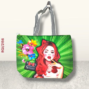 This stylish handbag is a perfect blend of vibrant colors and modern art-inspired design. Featuring a bold graphic print of a fashionable woman with striking red hair, paired with colorful floral accents and a chic mini bag illustration, it creates a lively and trendy look. The green pop-art style background adds a unique touch, while the sturdy black-and-white striped handles make it easy to carry. Spacious and lightweight, this bag is ideal for casual outings, shopping, or gifting, offering both functionality and a bold fashion statement.