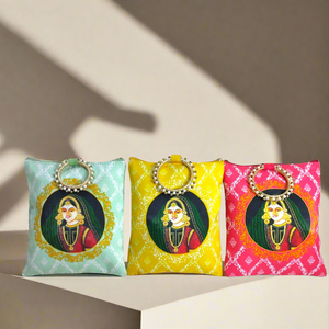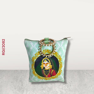 The pouch prominently displays a hand-painted or digitally printed portrait of a Rajasthani royal woman, often referred to as a “pink” or “Mahapink”. The woman is adorned with traditional Indian jewelry including large gold earrings, a Maang tikka (forehead ornament), necklace, and nose ring. Her elegant attire, likely a lehenga or traditional dress, is complemented by a rich emerald green veil draped over her head. The background of the bag is a soft mint green with a delicate white damask pattern, lending a touch of elegance and sophistication. The outer material appears to be a smooth satin, silk-blend, or faux leather, giving the bag a sleek and polished finish. The texture is likely soft to the touch with a slight sheen, contributing to its luxurious look. Digitally printed or hand-embellished artwork ensures durability and vivid color retention. The bag features a zipper closure at the top, making it secure and practical for carrying small items like cosmetics, phone, money, or jewelry. Perfect for weddings, festivals, or cultural events.