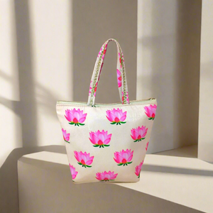 Discover the latest arrival in budget-friendly return gift bags with our 12-piece MOQ zip bags featuring elegant lotus print, perfect as wedding gift bags, Pichwai bags, or festive floral handbags, each with a 1kg capacity combining style and practicality. Ideal for those seeking affordable, stylish bags under 99 INR.