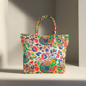 Celebrate tradition and artistry with this exquisitely handcrafted tote bag, a vibrant expression of Indian textile heritage. The bag features a stunning tapestry of colorful embroidery that captures the essence of folk and nature- inspired motifs. Designed on a sturdy .beige- toned canvas or jute fabric , the bag is adorned with an explosion. Peacocks, floral vines, and paisley elements dominate the pattern, giving the bag a lively, festive character. The symmetrical and dense embroidery work is a nod to traditional Indian craftsmanship, possibly drawing from regional styles like Kashida or Phulkari. Each element is meticulously stitched, creating a visually captivating mosaic that tells a cultural story. The handles are wrapped in matching fabric, padded for comfort and style, making it easy to carry even when fully loaded. Indian folk art with peacocks, floral pattens, and paisleys Spacious and durable, this tote is perfect for everyday use, shopping, festivals, or as a unique accessory to elevate any outfit. Casual wear, cultural events, gifting, or as a statement piece.