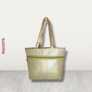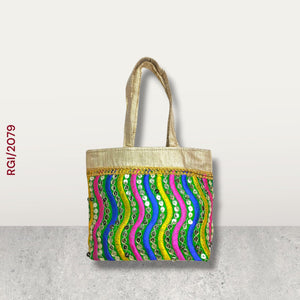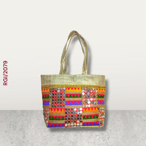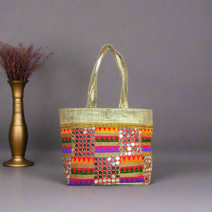 This handcrafted ethnic tote bag is a stunning fusion of traditional Indian artistry and vibrant design. With intricate embroidery, mirror work ,and shimmering fabric ,it serves as both a functional accessory and a statement piece. ideal for festive occasion ,cultural events, or as a unique fashion item. made from golden silk or brocade fabric, giving the bag an elegant shimmer. features a mix of geometric and tribal-inspired patterns including zigzag lines, triangle motifs, and horizontal bands. Hand stitched round mirrors are aligned vertically in neat columns, catching light and enhancing the festive look. spacious interior suitable for everyday essentials like wallet, phone, makeup, small notebook ,and more . Each bag is likely handmade by skilled artisans, reflecting the cultural heritage of regions like Rajasthan or Gujarat in India. The mirror making work and embroidery require precision and patience, making each piece unique. Traditional functions like weddings, festivals, (Diwali, Navratri, Holi, etc.) Ethic-themed parties or outfits Gift items or souvenirs Daily use for those who love cultural fashion.