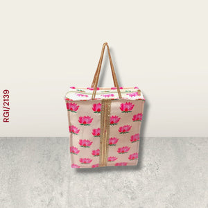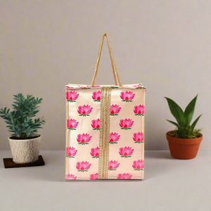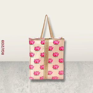 This elegant gift bag features a soft cream base adorned with vibrant pink lotus flower prints, creating a beautiful and traditional look. A golden embroidered lace runs vertically through the center, adding a touch of sophistication and festive charm. The sturdy golden handles provide both style and durability, making it perfect for carrying gifts, wedding favors, or festive goodies. Its eye-catching design blends cultural elegance with practical use, making it an ideal choice for special occasions.