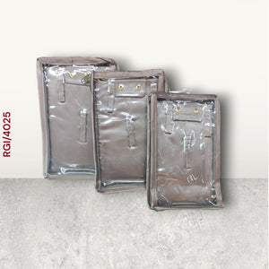 These satin-finish wardrobe organizers are crafted in a sleek grey shade and come in different sizes to suit various storage needs. Designed with sturdy stitching and reinforced eyelets, they provide durability while keeping garments, accessories, or essentials neatly arranged. Their compact, structured shape ensures space-saving storage, making them an elegant and practical solution for maintaining an organized wardrobe.