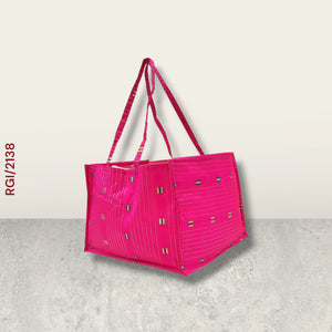 This spacious and stylish pink carry bag is crafted with a sturdy fabric base, adorned with golden square embellishments and fine vertical stitching for a refined look. Designed with long, matching handles for easy shoulder carrying, it offers ample storage for shopping, gifting, or festive use. Its vibrant color and durable build make it both a practical and eye-catching accessory for any occasion.