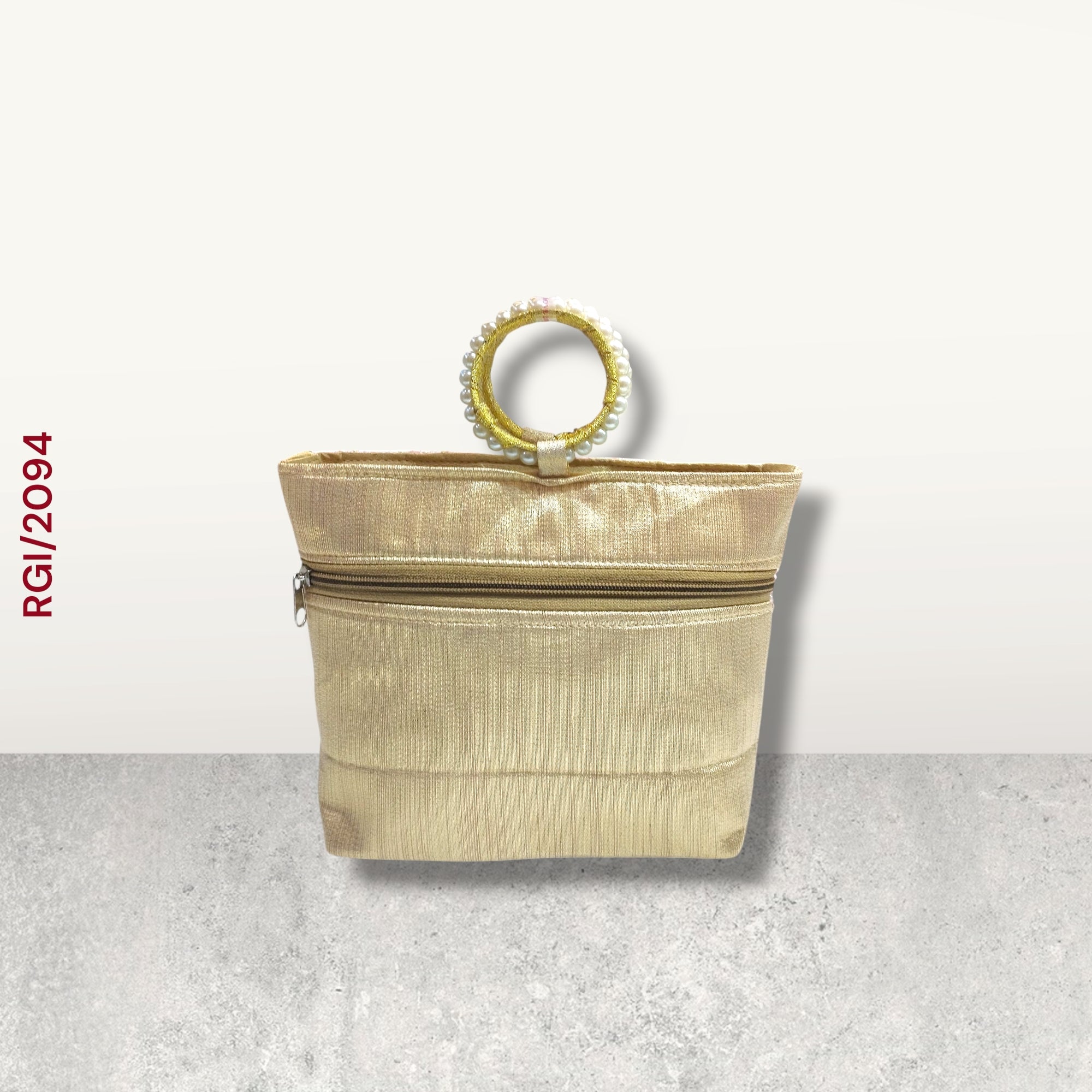 The highlight of the bag is its luxurious circular handle, wrapped in gold fabric and embellished with pearl accents, adding both elegance and ease of carrying.
