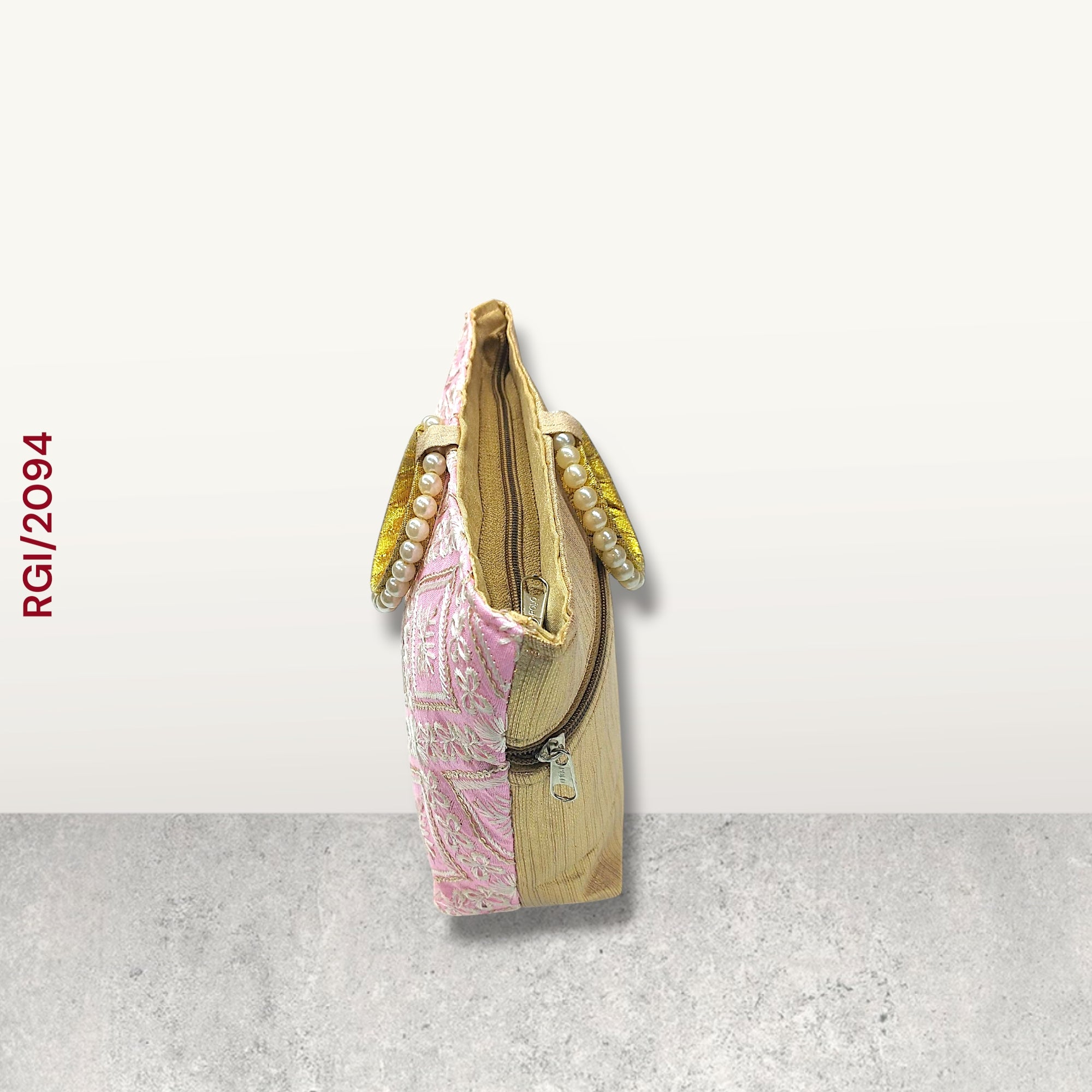 This stunning potli-style handbag features a soft pastel pink base adorned with intricate golden embroidery in floral and geometric diamond patterns. The delicate detailing gives it a rich, festive charm perfect for traditional occasions.