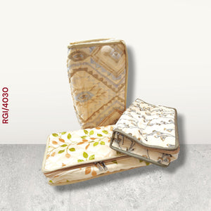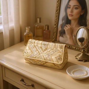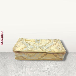 This is a beautifully designed storage bag in a soft golden shade with intricate geometric embroidery in silver and beige tones. Its rectangular shape with a zip closure makes it ideal for neatly storing sarees, garments, or other essentials while keeping them safe and organized. The quilted texture adds both durability and elegance, making it a perfect blend of style and utility. The code for this product is RGI/4030.