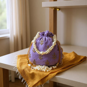A royal flair to your ethnic ensemble with the velvet potli collection, where timeless elegance meets traditional craftsmanship. These potlis are a blend of rich textures and minimalistic golden embroidery — a perfect choice for festive wear, wedding functions, or premium gifting. Premium velvet fabric that offers a plush, soft, and regal feel. Elegant hand embroidery in a gold thread Embroidered with scattered leaf motifs giving a neat and luxurious look. Maroon Wine Lavender Purple Champagne Beige These shades exude grace and match a wide range of traditional and Indo-western outfits. Compact round shape with gathered top closure. Golden cord drawstring with detailed pearl tassels at the ends. Double-strand pearl handle with alternating pearl sizes — elegant and easy to carry on wrist. Ideal size to carry essentials like mobile, cash, cards, and makeup items. Inner lining adds durability. Lightweight yet festive – suitable for both casual and grand events. Bridesmaids’ accessories Festive Gifting Wedding giveaways Styling with sarees, lehengas, anarkalis, and more.